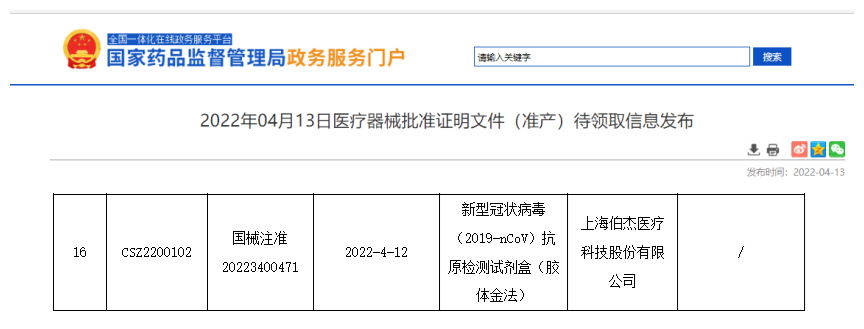4月13日,由伯杰醫(yī)療自主研發(fā)的新型冠狀病毒2019-nCoV抗原檢測試劑盒(膠體金法)【醫(yī)療器械注冊證編號:國械注準20223400471】獲得國家藥監(jiān)局審批,正式上市。